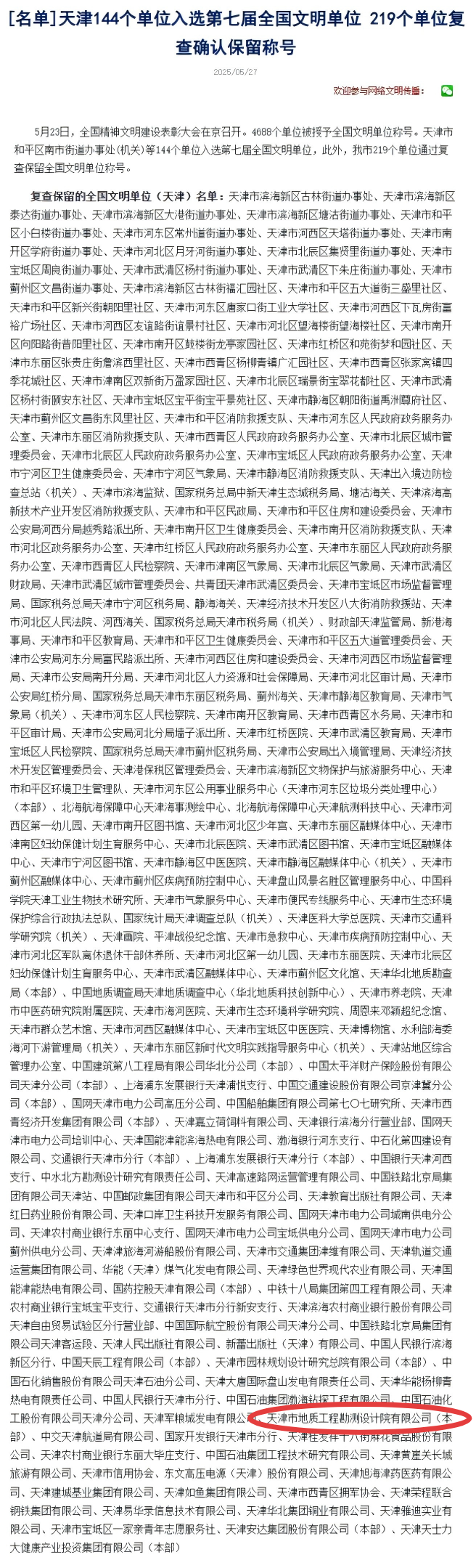 喜報!天津市地質工程勘測設計院有限公司 順利通過全國文明單位復查確認